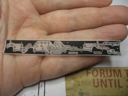 And now for my favourite method, the positive photoresist. I make a solution fresh in the tray by tipping a small amount of caustic soda granules in the developing tray and adding water, then waiting for it to dissolve. It is probably more scientific to start with a stronger solution and then dilute it in the tray, but I never have to store or waste any solution this way, and I am pretty good at guessing the quantity. Never add granules while developing, as if they touch the board they will not only ruin the exposure but they will also attack the copper if strong enough. Always make sure all the granules are dissolved first. Due to its causticity, gloves and eye protecting are essential. Fairly soon the tracks will appear as the unexposed area is washed away. The coating is much thinner than Riston, and there is no sludgy precipitate. In this case we want to err on the side of underexposing, as if we overexpose we will lose our artwork very quickly. Even if there is still a hint of coating on the unexposed part this will often wash away when we rinse the board. If we find that the exposure is uneven across the board we can pick up the board (with gloves or plastic tongs) and dip only the underexposed part. When complete we proceed to etching. I have personally found this method easiest to master and boards made this way have superb resolution. As an example, my name appears on the board at the top of the first page. I have excellent eyesight but I struggle to read it, yet the letters are all perfectly formed. The artwork is only 12.5mm wide, and this was one of my earliest attempts.