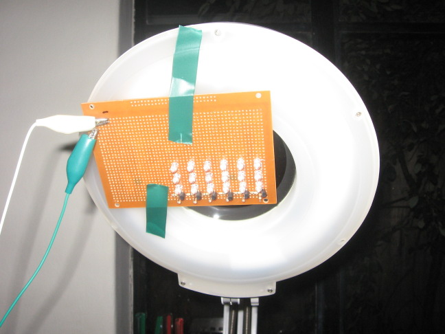 | This photo shows the UV LED array when it is switched off. To position the lamp effectively over the board to be exposed I simply tape the array to my pantograph style illuminated magnifier. This way I can easily adjust the height of the lamp over the work. I am not sure how safe it is to look into the LED array when it is on. I usually leave the room when an exposure is being. If one needs to look at the beam for any amount of time you should wear eye protection such as sunglasses that have an approved UV rating. As you can see from the photo the battery is connected to the lamp with mini alligator leads. | ![]() |