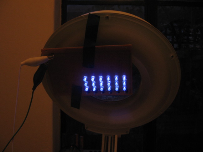 | This photo was taken without a flash with the LED array switched on. Although the LED's appear blue in the photo they look violet in real life. Of course most of their output is in the invisible UV spectrum, as anything under the lamp the is fluorescent glows angrily, especially bleached paper which glows bright blue. I assume either the camera CCD picks up the invisible UV as a blue colour, or it is simply unable to render the pinkish violet properly due to the particular white balance selected, which as I recall was optimised for indoor use for tungsten bulbs. | ![]() |