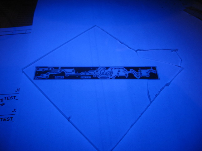 The above board is being exposed under the UV lamp, being held in place by a scrap piece of perspex. The reason everything looks blue is because the paper underneath is fluorescing and all the other lights are off. If you are going to watch the entire process it is probably a good idea to wear sunglasses.