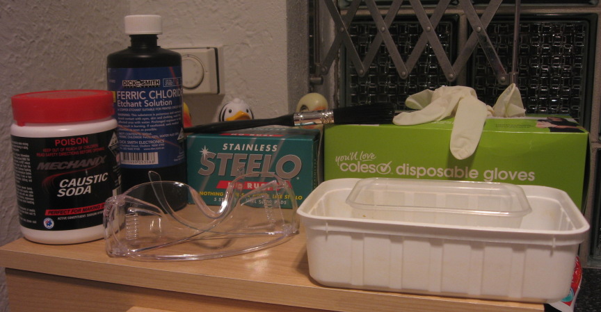 The above photo shows the typical implements of developing and etching boards. The rubber ducks in the background were not part of the experiment.
