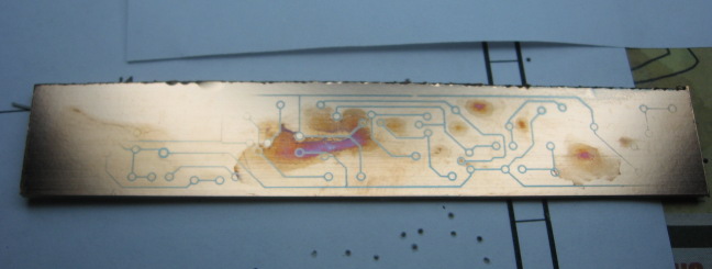 | This positive photoresist board was badly overdeveloped. As developing was taking a long time I added a few granules of caustic soda. These accidentally touched the board, overdeveloping it instantly. In fact the causticity seems to have attacked the copper itself. There are still some faint remnants of tracks left. | ![]() |