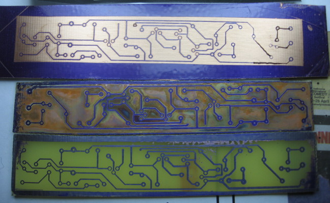 | These boards are all failed attemps at developing using Riston. The first one was overdeveloped and had to be touched up by pen. It was not yet etched. The second one was discovered while etching to be badly underdeveloped, showing up as faint blue areas, so etching was abandoned half way through. The last was completely etched but when inspected revealed to be also slight underdeveloped. | ![]() |